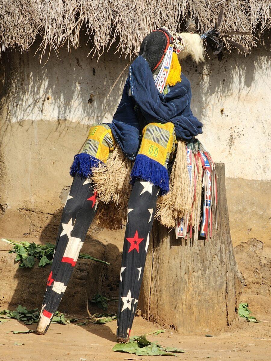 2. Ceremonia: Dansatorul mascat nu este considerat un om, ci o extensie a spiritului, fiind acoperit complet de costume din rafie și pânză.