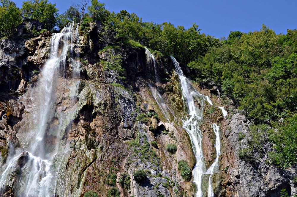 Sistemul de lacuri este împărțit în două secțiuni: Lacurile de Sus (12 lacuri pe rocă dolomitică, înconjurate de păduri dense) și Lacurile de Jos (4 lacuri în canioane de calcar), unde se află și Marea Cascadă (Veliki Slap), cea mai înaltă din Croația (78 metri).