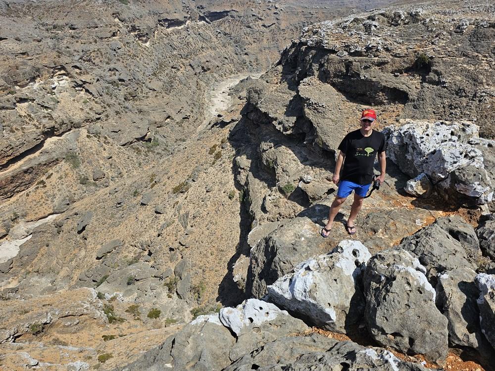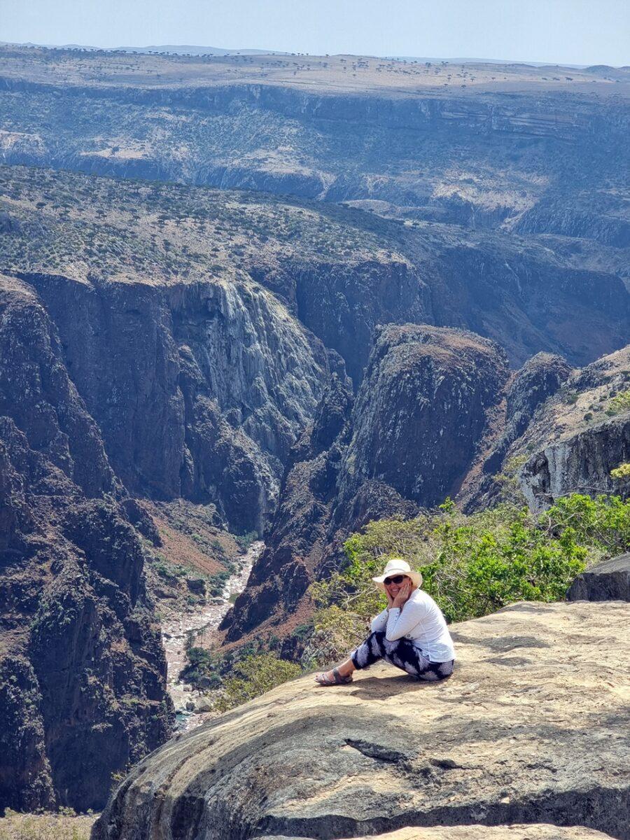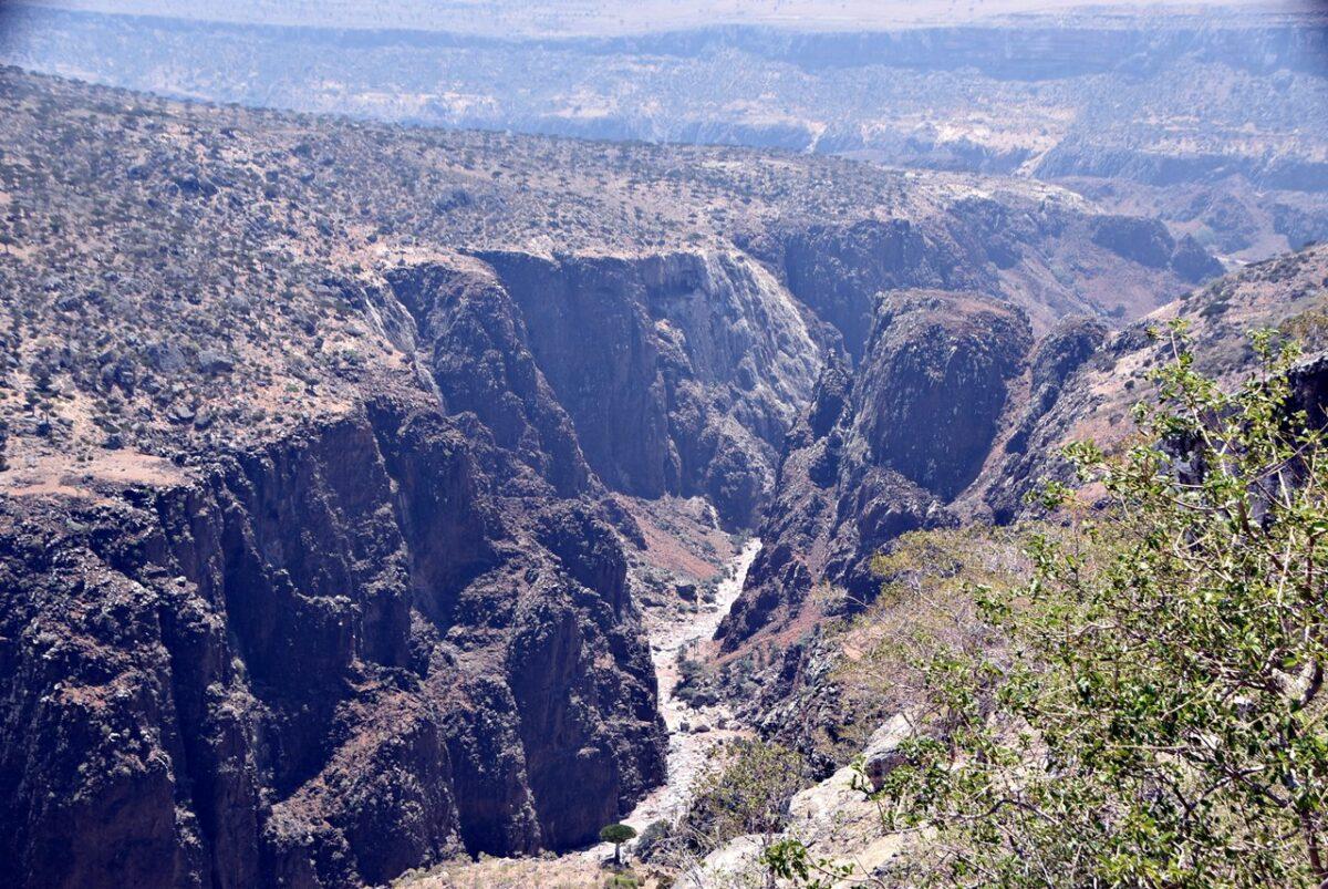 Panorama: de aici, platoul se termină brusc într-o prăpastie amețitoare care dă spre Wadi Dirhur. Vei vedea cum canionul taie muntele, iar în depărtare, munții Hajhir (cele mai înalte vârfuri de granit de pe insulă) străpung norii.