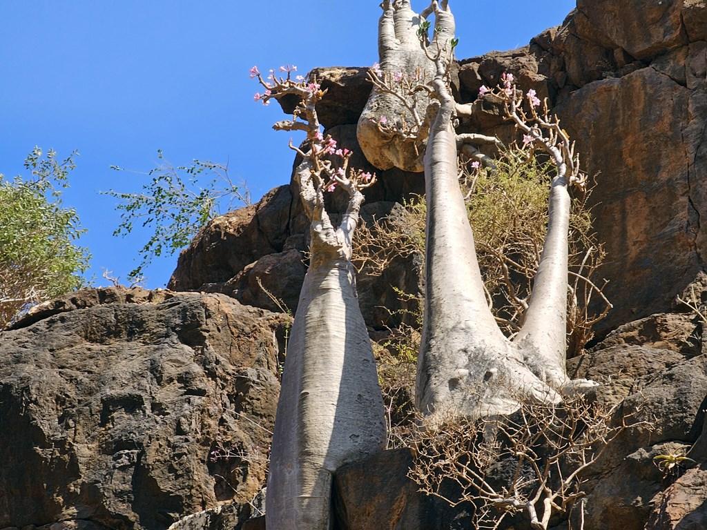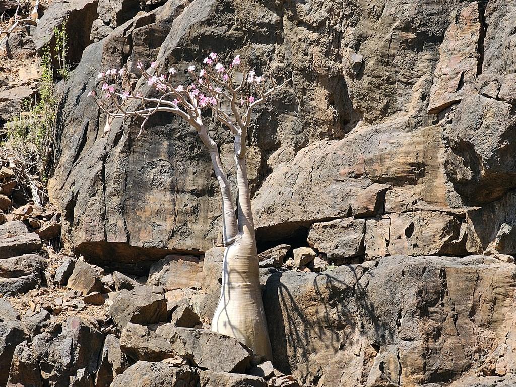 Vegetația: Pe pereții canionului cresc adesea „arbori butelie” (Adenium obesum) care înfloresc în roz, creând un contrast cromatic uluitor.