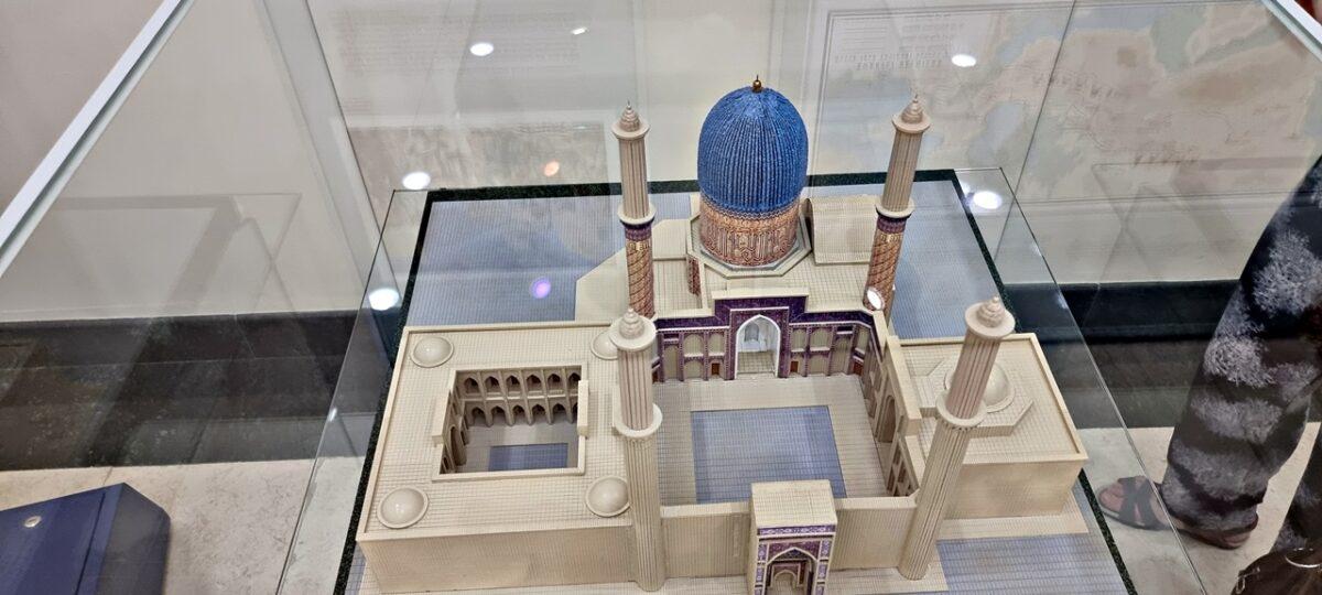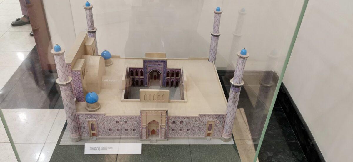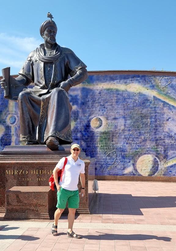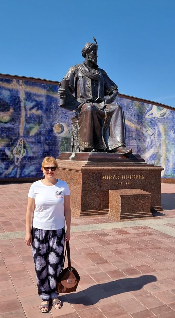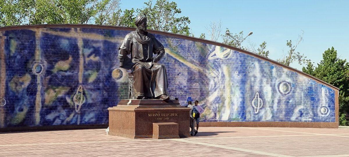 -Statuia lui Ulugh Beg: La intrare se află un monument impunător dedicat lui Ulugh Beg, așezat pe un fundal albastru ce simbolizează cerul înstelat.