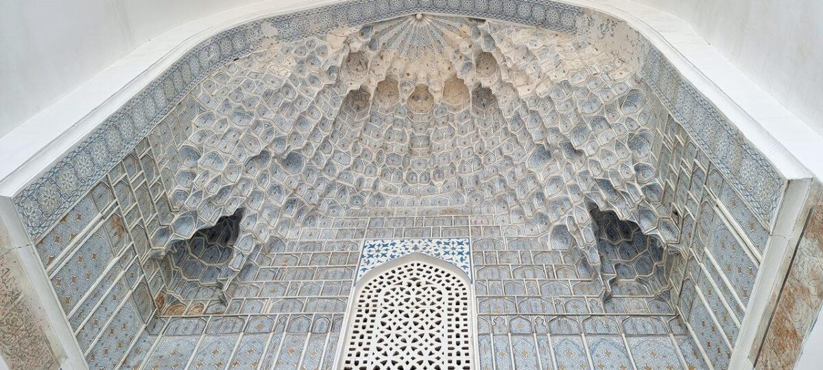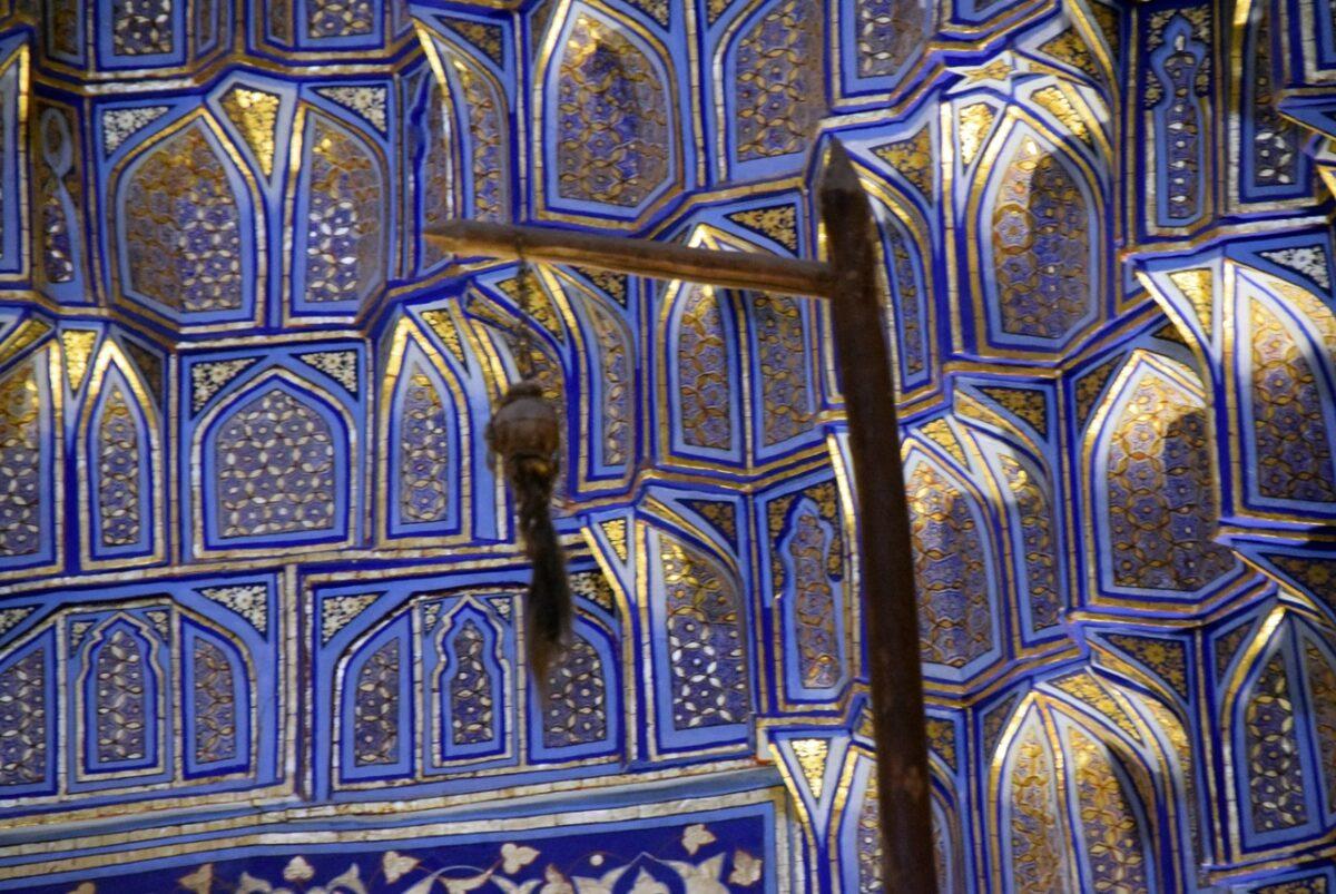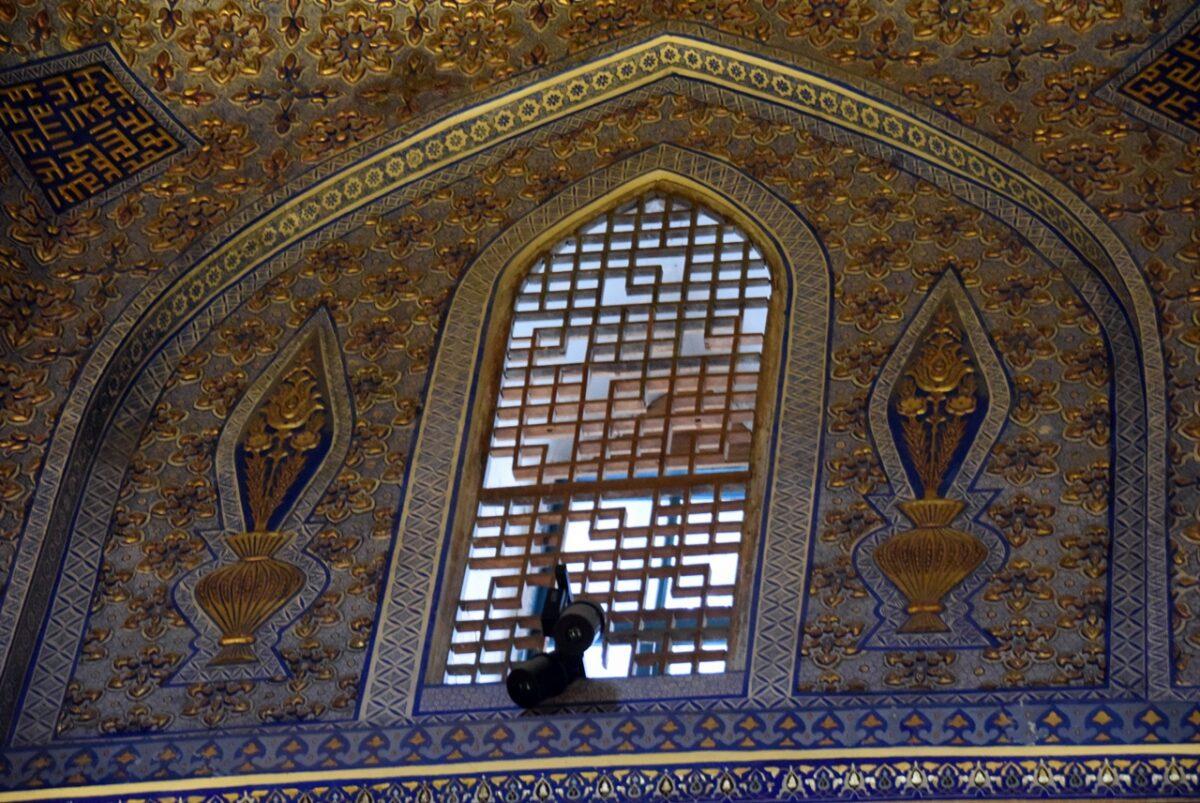 -Interiorul Opulent: Pereții sunt decorați cu panouri de onix, picturi în aur și inscripții caligrafice. Tavanul este o capodoperă a tehnicii kundal, fiind încărcat cu decorațiuni aurite care creează o atmosferă ireală.